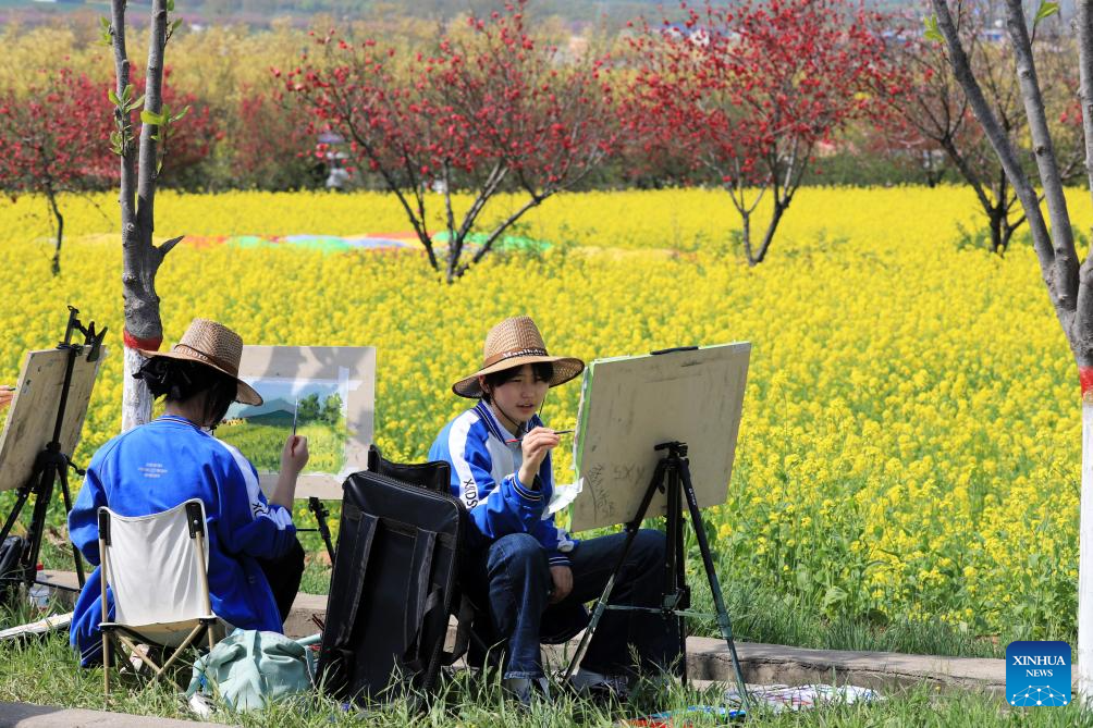 Students paint from life at a rapeseed flower field in Xuchang, central China's Henan Province, April 3, 2026. Qingming Festival, or Tomb-Sweeping Day, falls on April 5 this year. It is a traditional Chinese festival for people to pay tribute to the dead and worship their ancestors. The holiday also provides a short break for Chinese citizens as they engage in outdoor activities and sightseeing. (Photo by Niu Shupei/Xinhua)