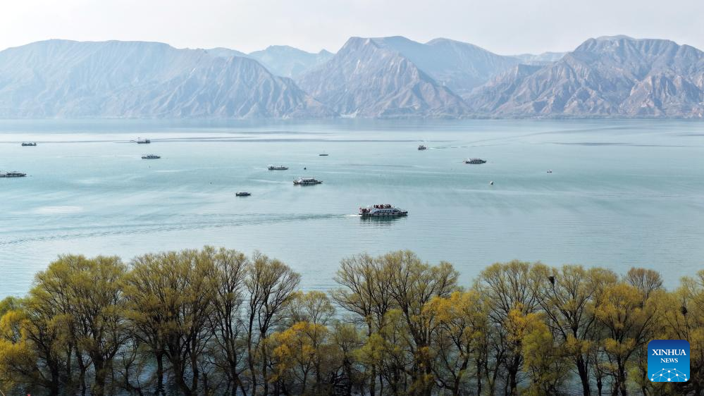 An aerial drone photo taken on April 2, 2026 shows tourists enjoying the scenery during boat rides in Liujiaxia Reservoir, northwest China's Gansu Province. Qingming Festival, or Tomb-Sweeping Day, falls on April 5 this year. It is a traditional Chinese festival for people to pay tribute to the dead and worship their ancestors. The holiday also provides a short break for Chinese citizens as they engage in outdoor activities and sightseeing. (Photo by Shi Youdong/Xinhua)