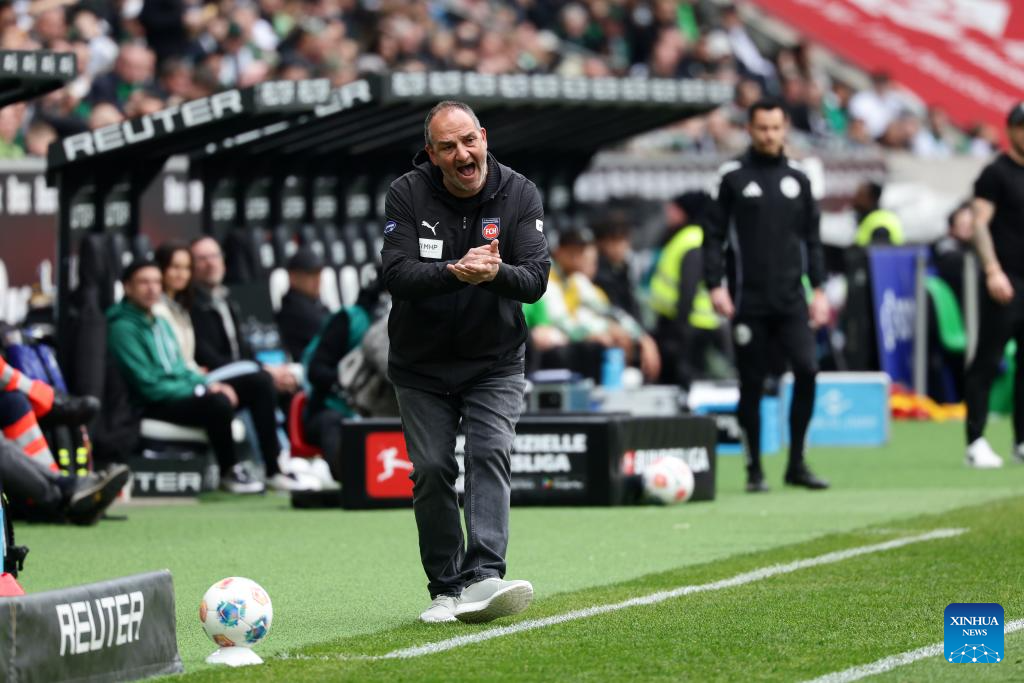 Frank Schmidt, head coach of 1. FC Heidenheim 1846, reacts during the German first division of Bundesliga football match between Borussia Moenchengladbach and 1. FC Heidenheim 1846 in Moenchengladbach, Germany, April 4, 2026. (Photo by Joachim Bywaletz/Xinhua)