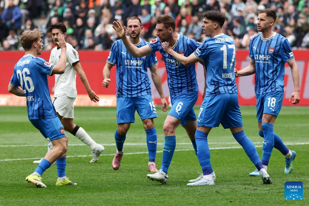 Players of 1. FC Heidenheim 1846 celebrate scoring during the German first division of Bundesliga football match between Borussia Moenchengladbach and 1. FC Heidenheim 1846 in Moenchengladbach, Germany, April 4, 2026. (Photo by Joachim Bywaletz/Xinhua)