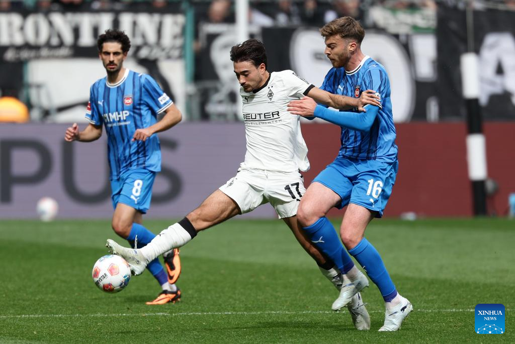 Jens Castrop (C) of Borussia Moenchengladbach vies with Julian Niehues (R) of 1. FC Heidenheim 1846 during the German first division of Bundesliga football match between Borussia Moenchengladbach and 1. FC Heidenheim 1846 in Moenchengladbach, Germany, April 4, 2026. (Photo by Joachim Bywaletz/Xinhua)