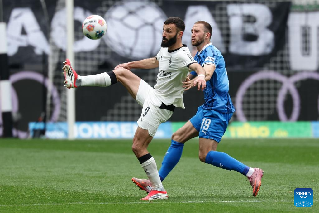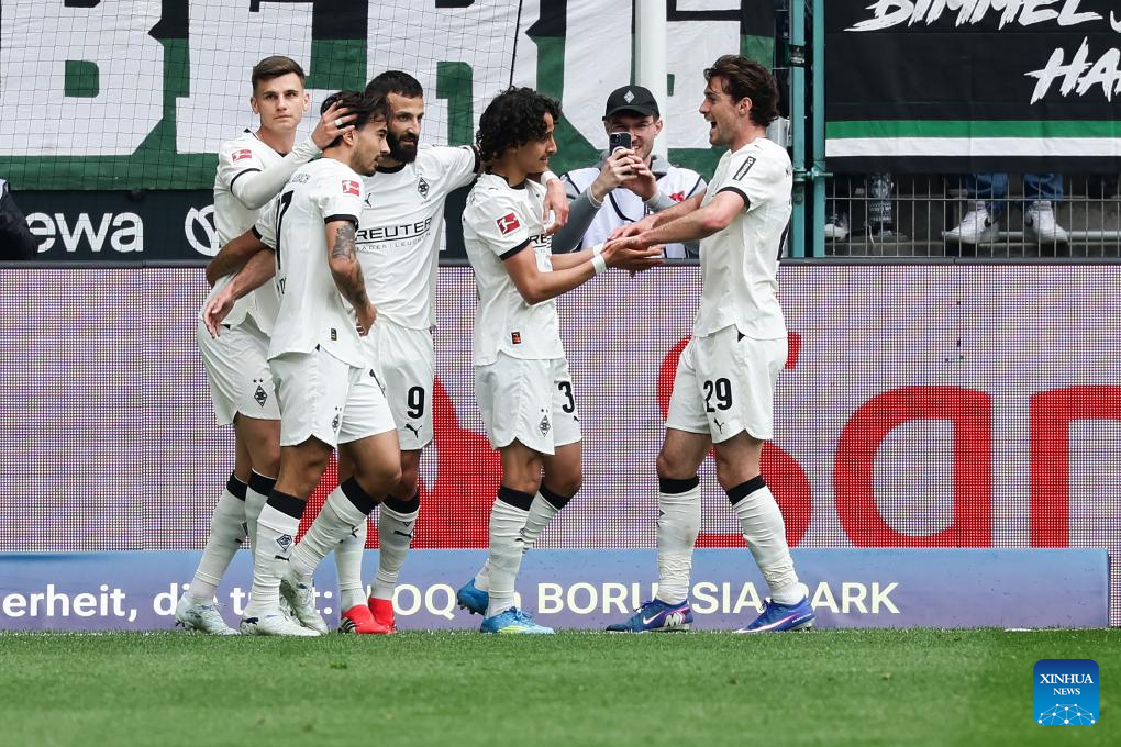Players of Borussia Moenchengladbach celebrate scoring during the German first division of Bundesliga football match between Borussia Moenchengladbach and 1. FC Heidenheim 1846 in Moenchengladbach, Germany, April 4, 2026. (Photo by Joachim Bywaletz/Xinhua)