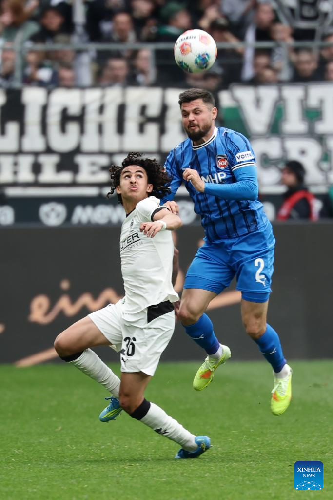 Marnon Busch (top) of 1. FC Heidenheim 1846 heads for the ball during the German first division of Bundesliga football match between Borussia Moenchengladbach and 1. FC Heidenheim 1846 in Moenchengladbach, Germany, April 4, 2026. (Photo by Joachim Bywaletz/Xinhua)
