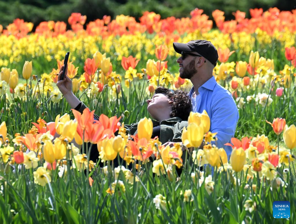 People take selfies with blooming flowers at a park in Valeggio sul Mincio, Verona, Italy, April 4, 2026. (Photo by Alberto Lingria/Xinhua)