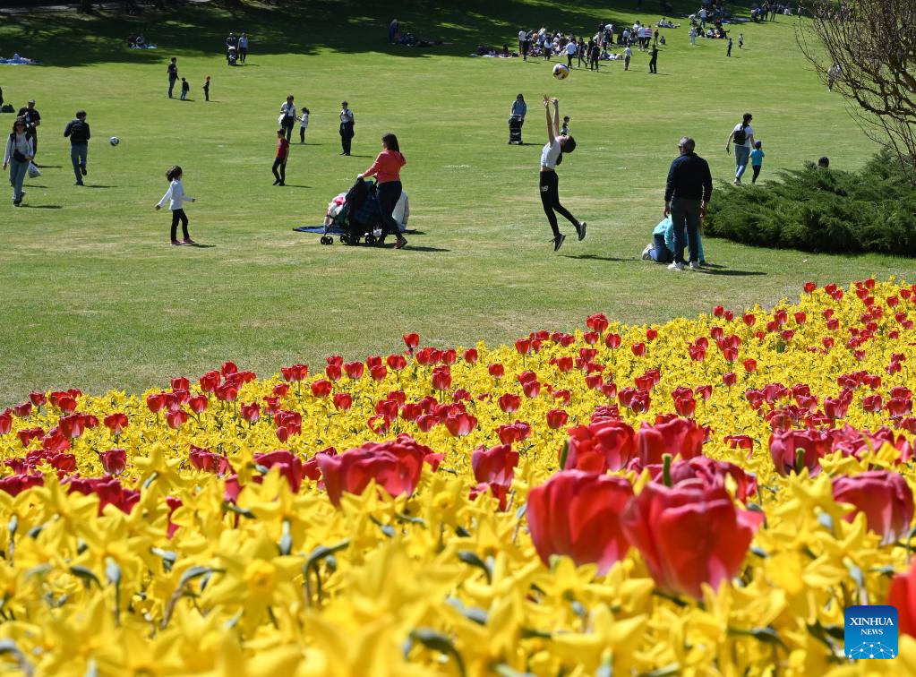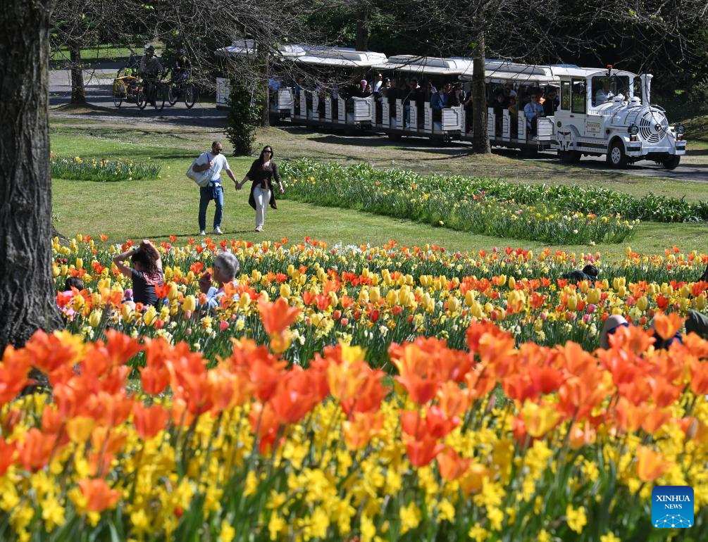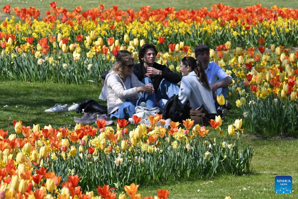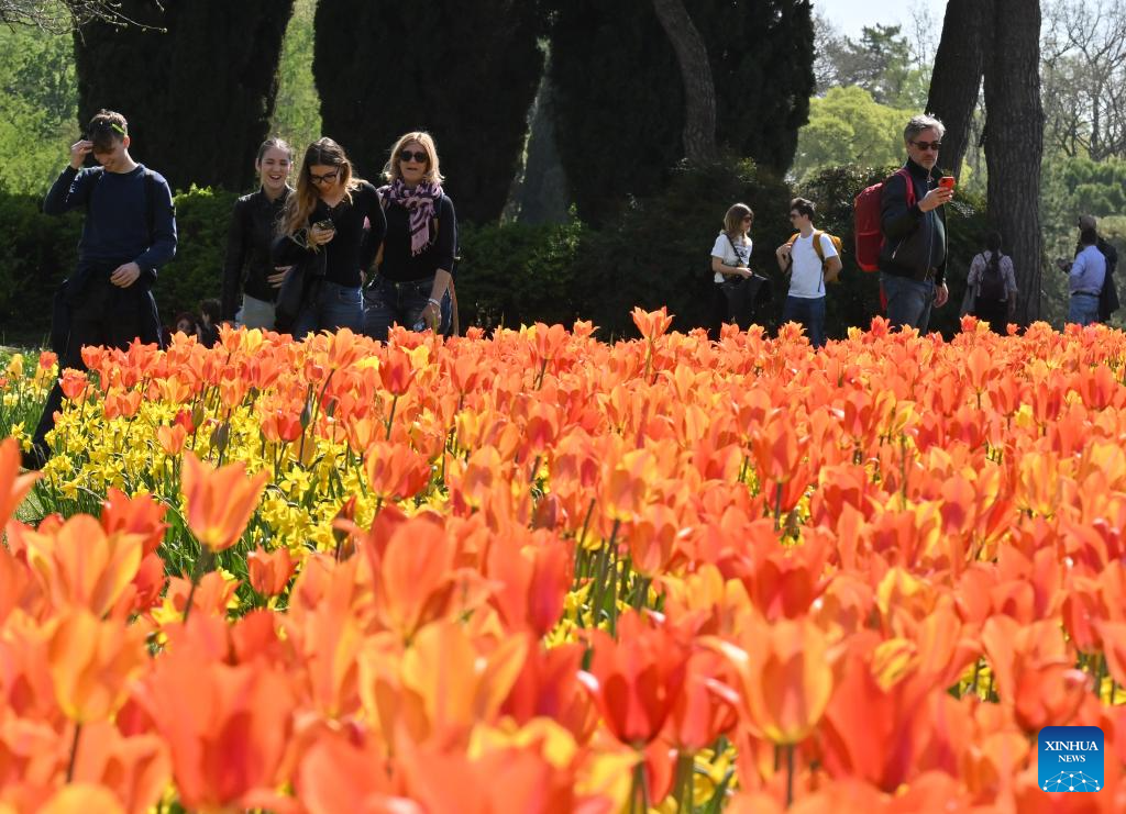 People enjoy blooming flowers at a park in Valeggio sul Mincio, Verona, Italy, April 4, 2026. (Photo by Alberto Lingria/Xinhua)