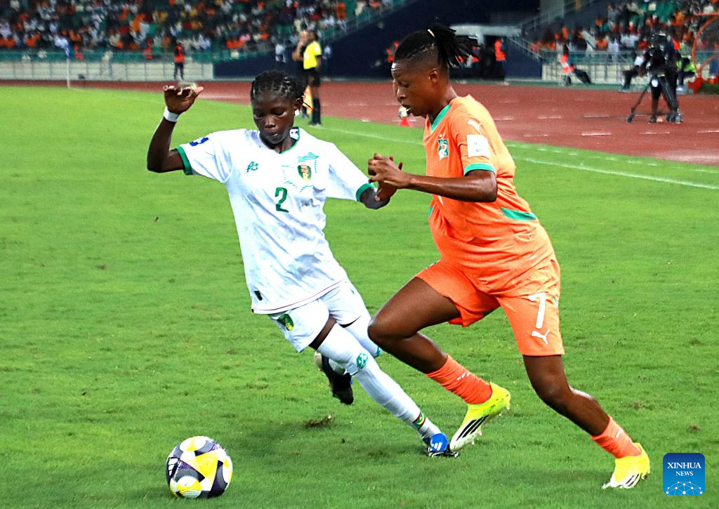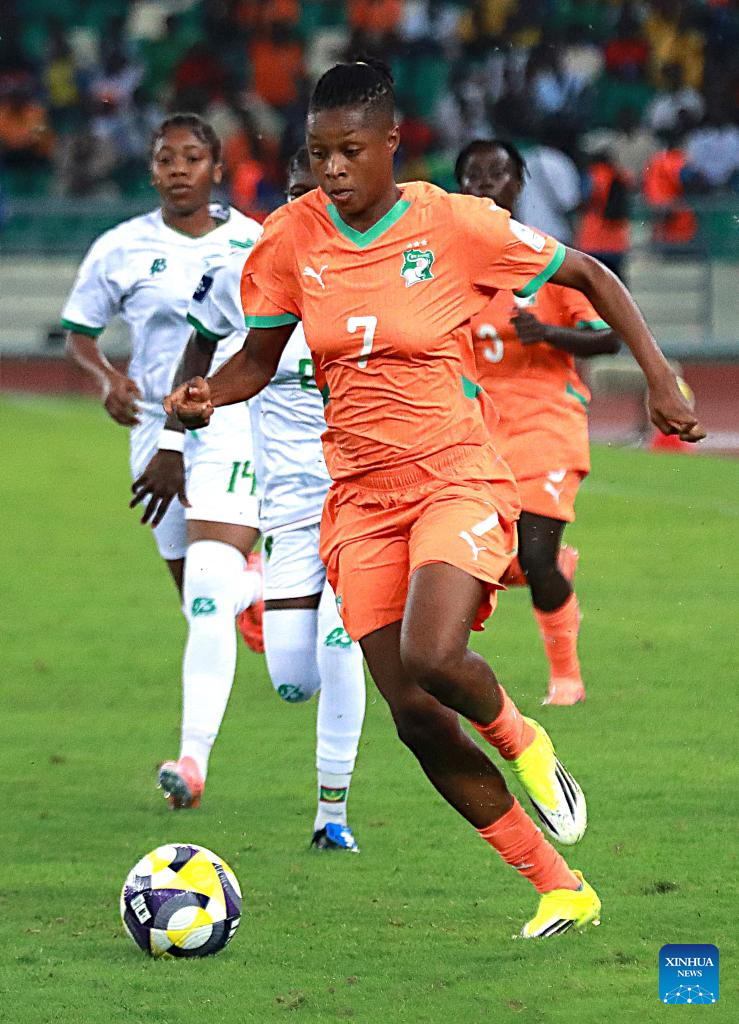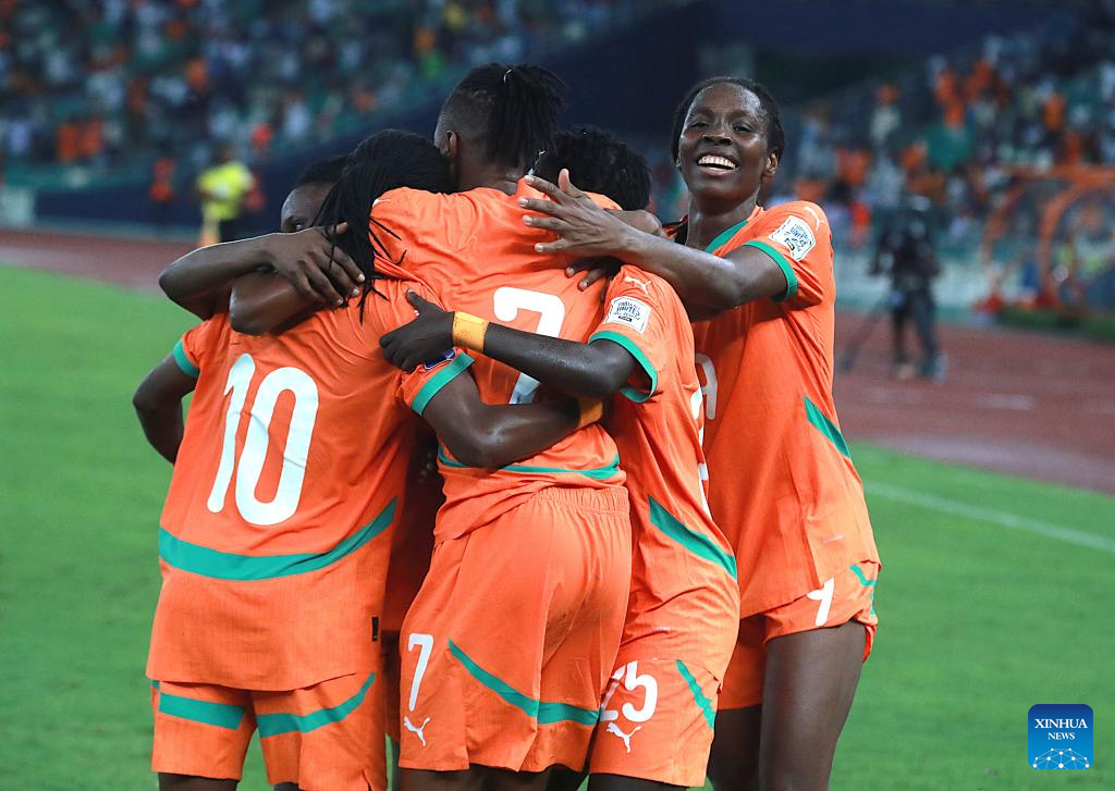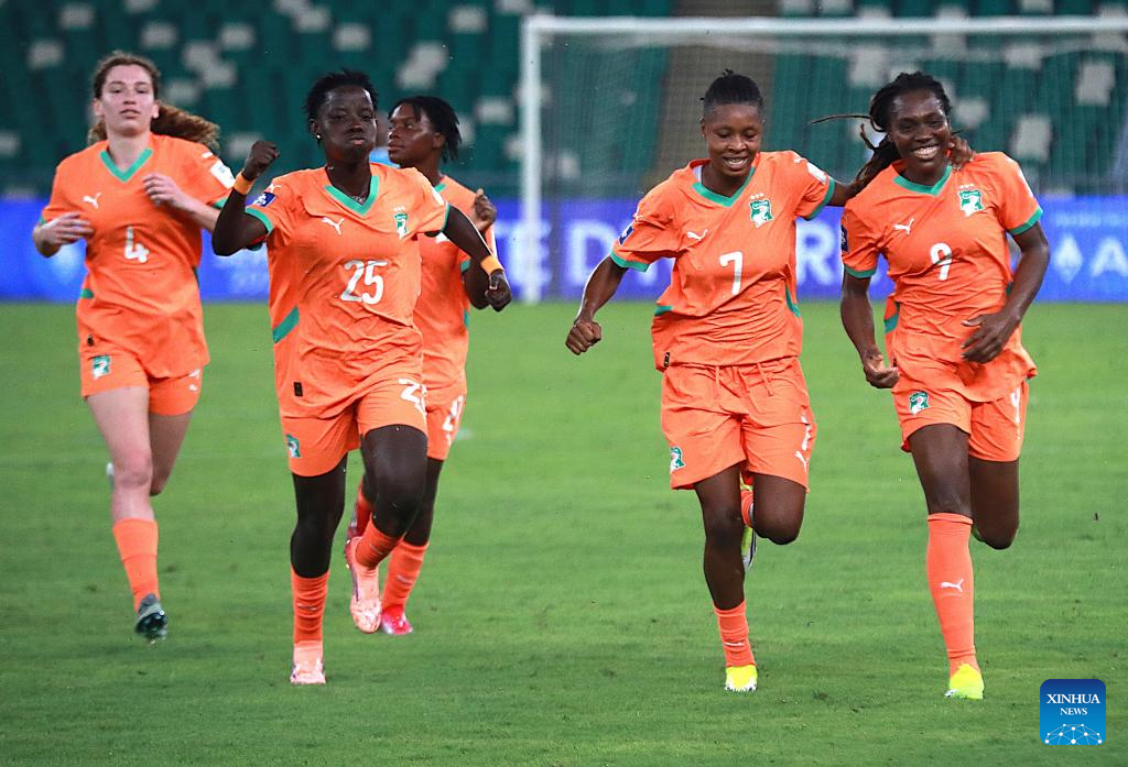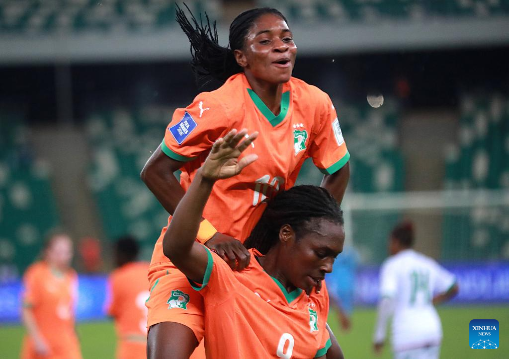 Players of Cote d'Ivoire celebrate scoring during an international women's football friendly match between Cote d'Ivoire and Mauritania in Abidjan, Cote d'Ivoire, on April 9, 2026. (Photo by Yvan Sonh/Xinhua)