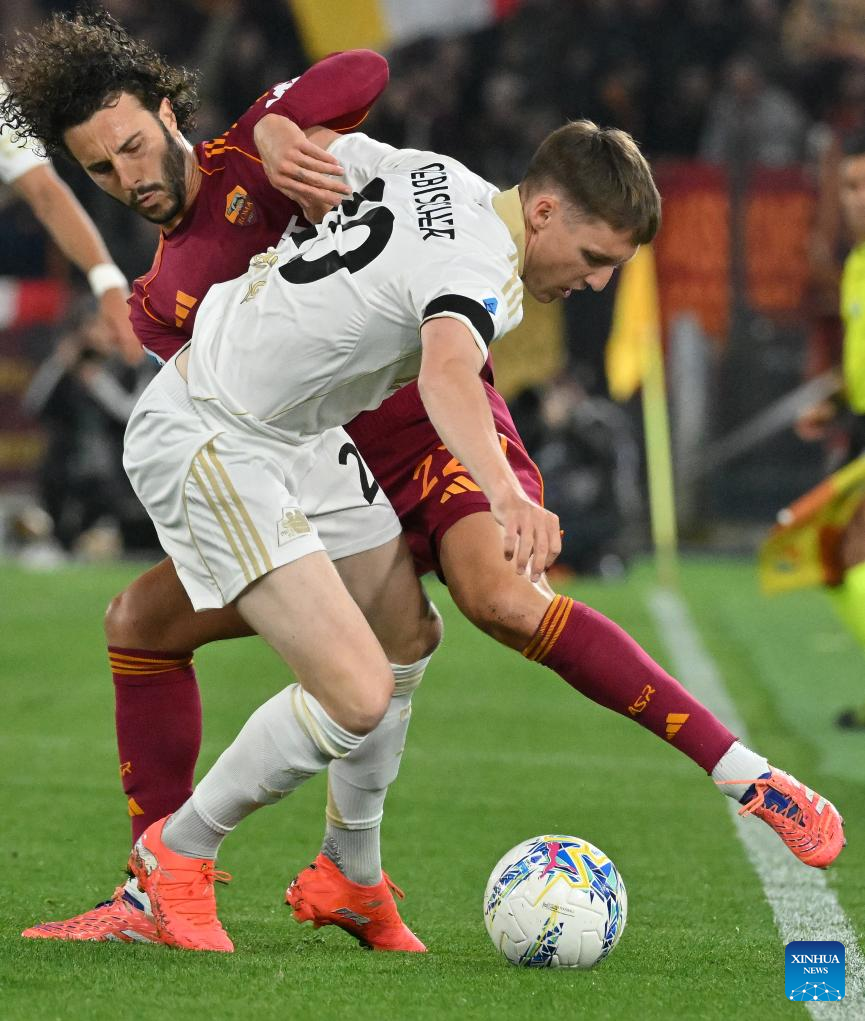 Roma's Lorenzo Pellegrini (L) vies with Pisa's Arturo Calabresi during a Serie A soccer match between Roma and Pisa in Rome, Italy, April 10, 2026. (Photo by Alberto Lingria/Xinhua)