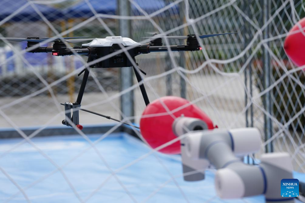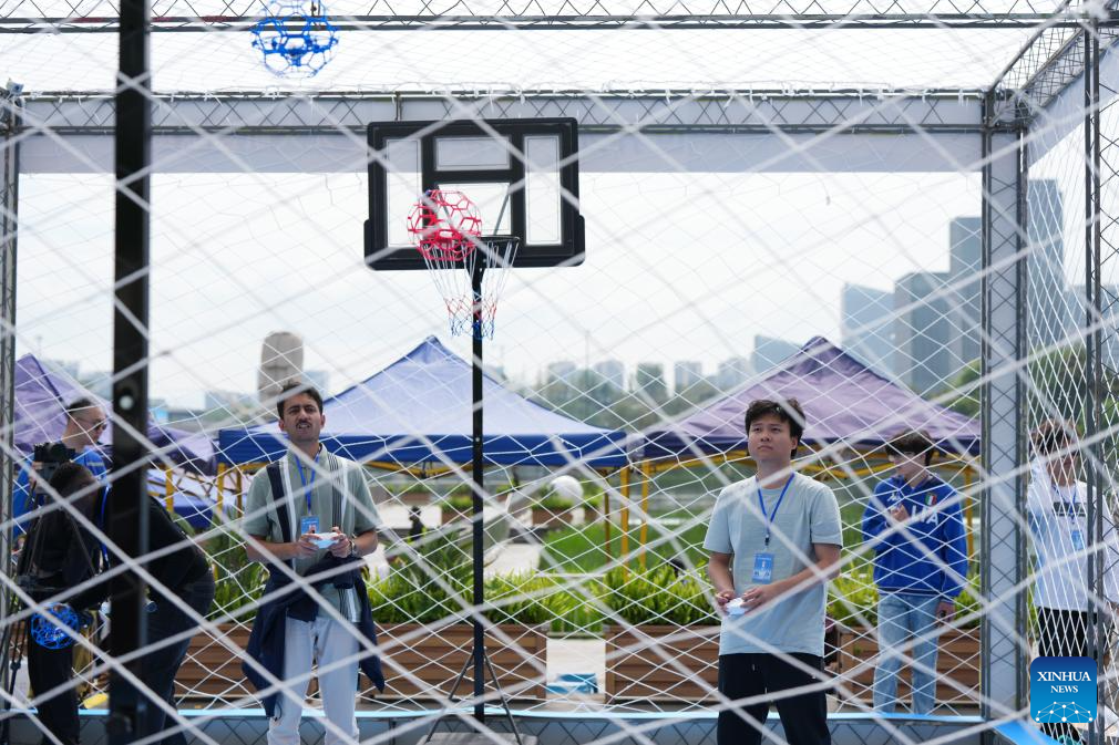 A competitor operates a drone in the drone basketball event during a drone sports meeting which combines technology and competitive sports in Chengdu, southwest China's Sichuan Province, April 11, 2026. (Xinhua/Xu Bingjie)