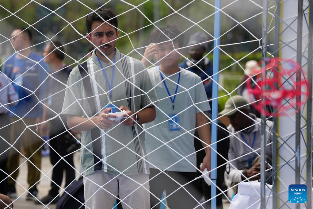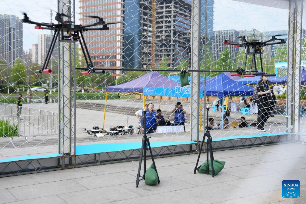 A competitor operates a drone in the drone fencing event during a drone sports meeting which combines technology and competitive sports in Chengdu, southwest China's Sichuan Province, April 11, 2026. (Xinhua/Xu Bingjie)