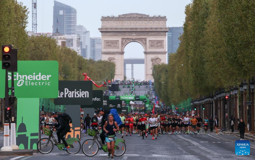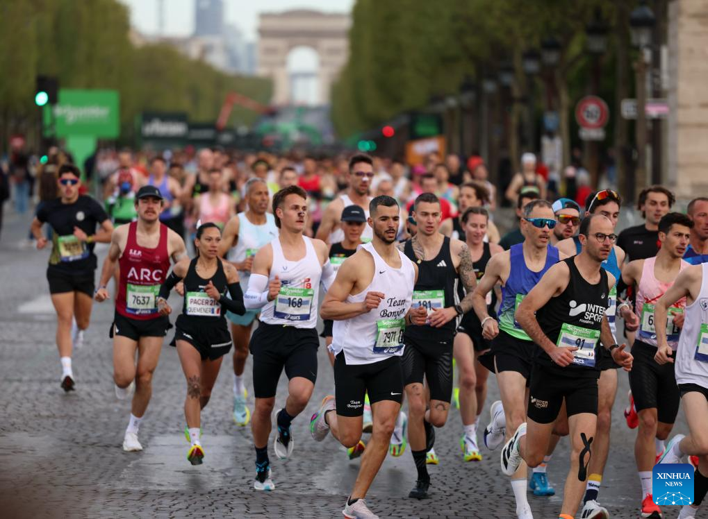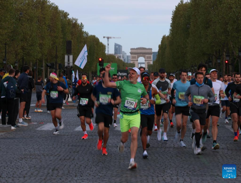 Participants run across Champs-Elysees Avenue during the Paris Marathon 2026 in Paris, France, April 12, 2026. (Xinhua/Wu Huiwo)