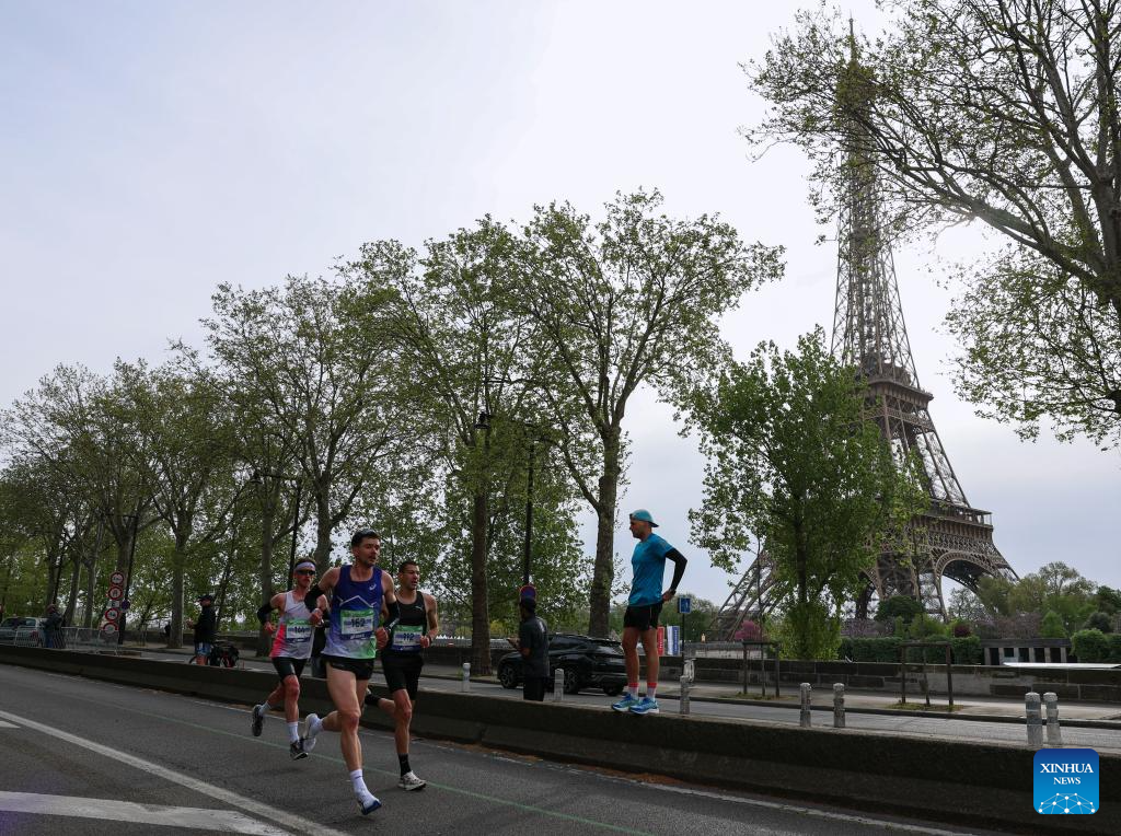 Participants run past the Eiffel Tower during the Paris Marathon 2026 in Paris, France, April 12, 2026. (Xinhua/Wu Huiwo)