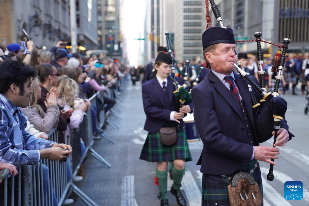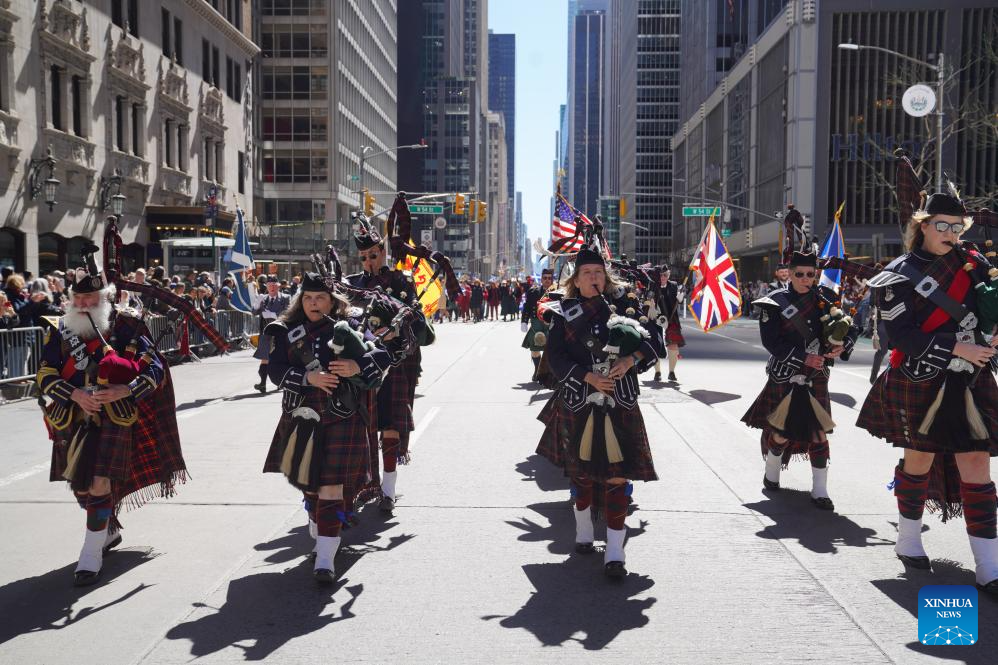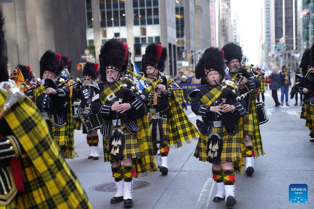Participants are pictured at the annual Tartan Day Parade in New York, the United States, on April 11, 2026. More than 3,000 bagpipers, highland dancers and other participants marched to celebrate the annual Tartan Day here on Saturday. The event was held to mark the existing and historical links between Scotland and Scottish descendants in the U.S.. (Xinhua/Zhang Fengguo)