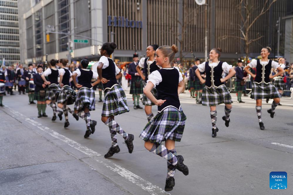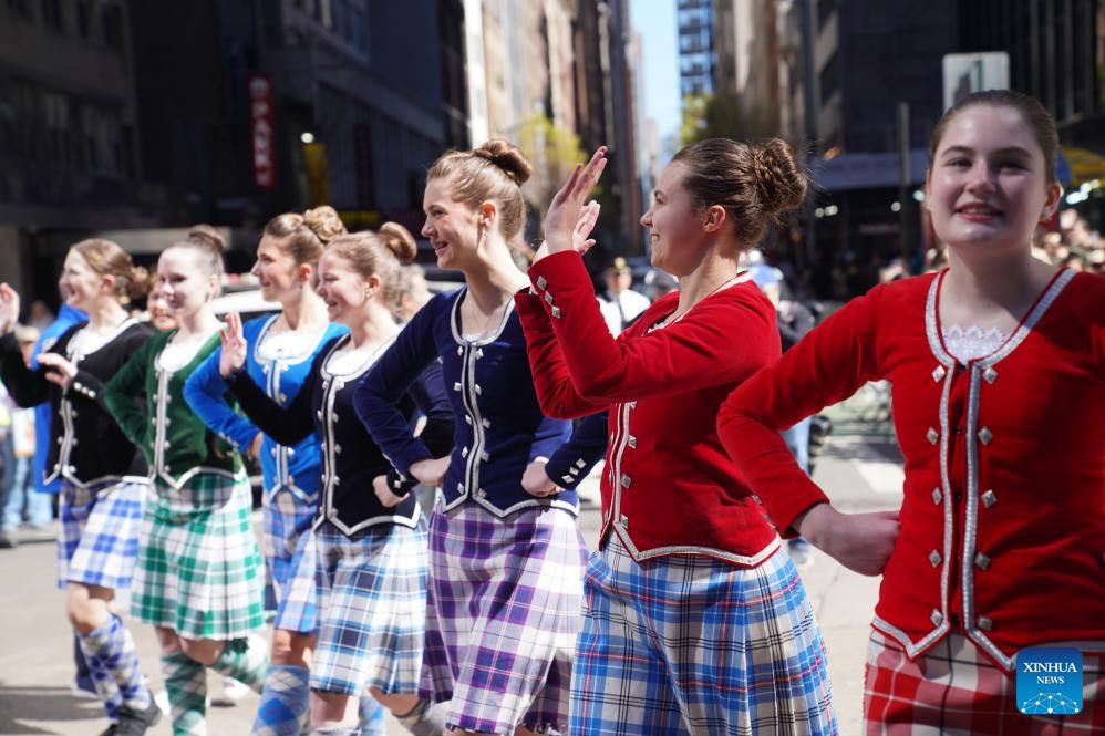 Participants dance during the annual Tartan Day Parade in New York, the United States, on April 11, 2026. More than 3,000 bagpipers, highland dancers and other participants marched to celebrate the annual Tartan Day here on Saturday. The event was held to mark the existing and historical links between Scotland and Scottish descendants in the U.S.. (Xinhua/Zhang Fengguo)