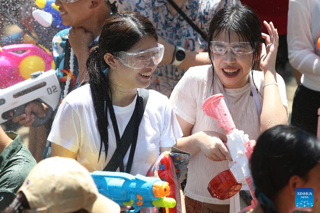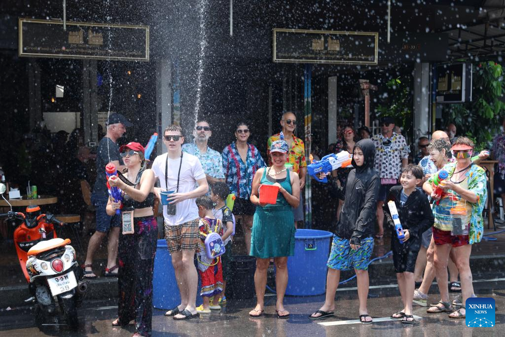 People take part in the celebration of the Songkran festival in Bangkok, Thailand, April 13, 2026. Songkran, a traditional Thai New Year festival, is celebrated from April 13 to 15 this year, during which people express greetings by splashing water on each other. (Xinhua/Rachen Sageamsak)
