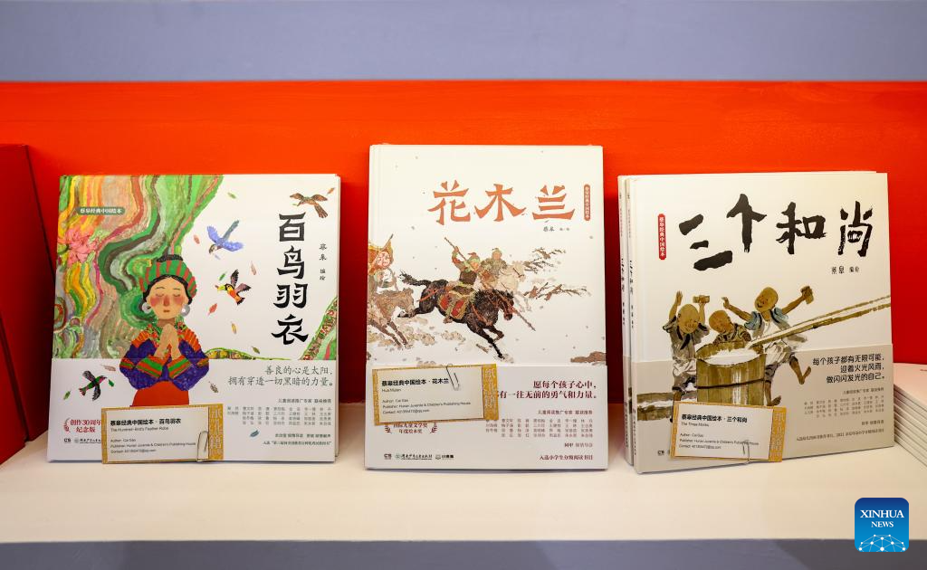 Photo taken on April 13, 2026 shows books illustrated by Cai Gao on the Bologna Children's Book Fair in Bologna, Italy. Chinese illustrator Cai Gao won the 2026 Hans Christian Andersen Award, with the announcement made on Monday at the Bologna Children's Book Fair in Italy. The award was established in 1956 by the International Board on Books for Young People, a leading international organization dedicated to promoting children's books. It is presented biennially to a living author and illustrator whose work has made a lasting contribution to children's literature. (Xinhua/Wang Kaiyan)