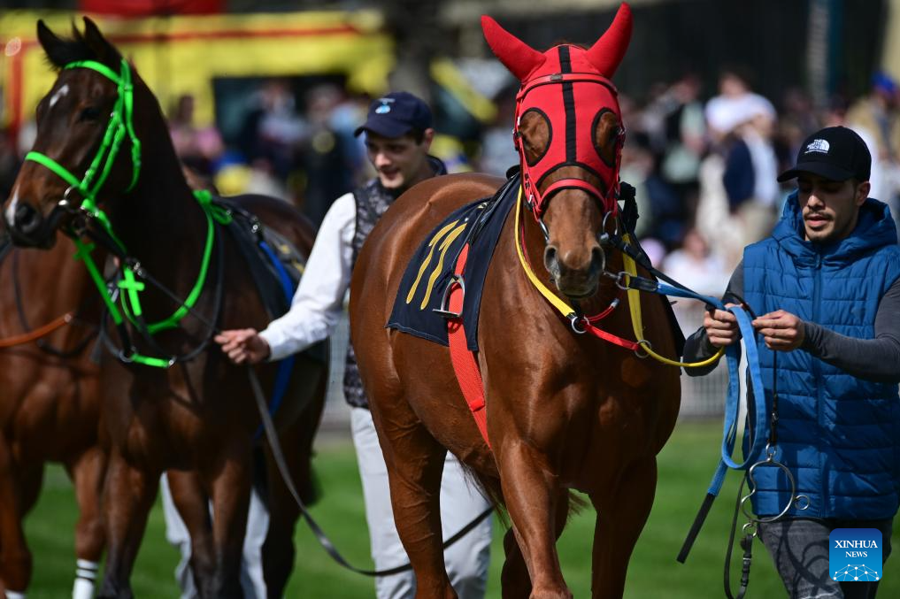 Horses are led before a race at the Sluzewiec Racetrack in Warsaw, Poland, on April 19, 2026. The racetrack opened its 2026 season on April 19, which will run until November. (Photo by Aleksy Witwicki/Xinhua)