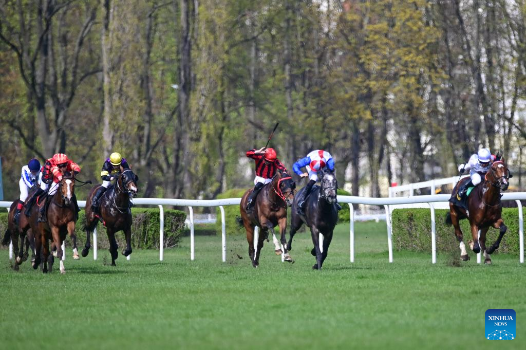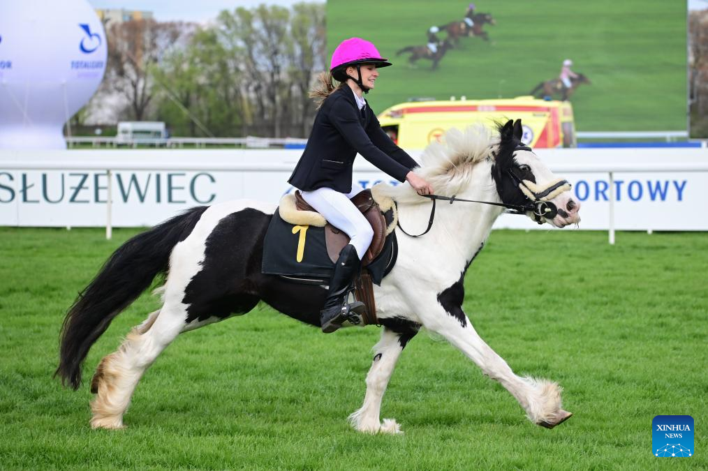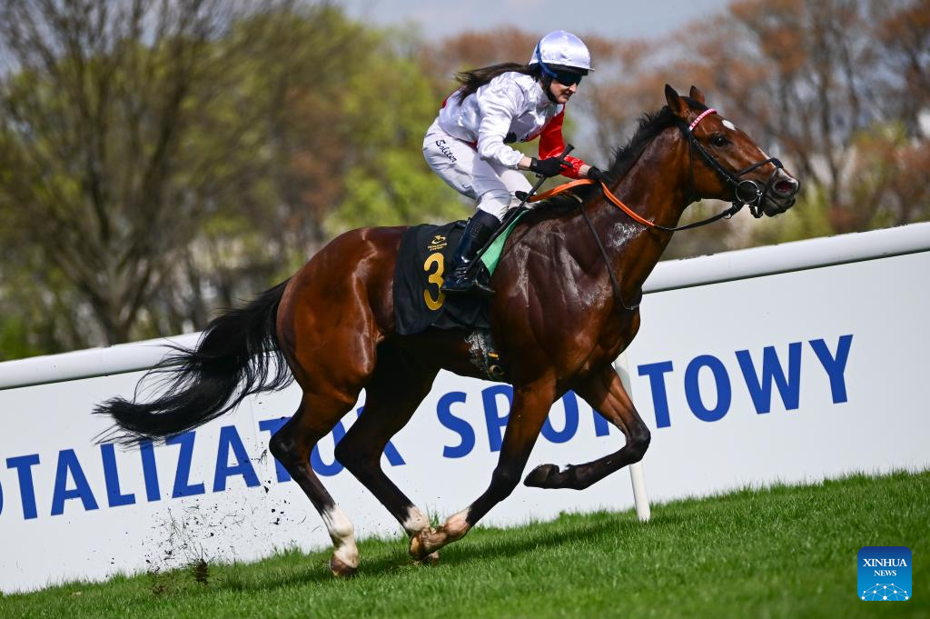A jockey rides a horse at the Sluzewiec Racetrack in Warsaw, Poland, on April 19, 2026. The racetrack opened its 2026 season on April 19, which will run until November. (Photo by Aleksy Witwicki/Xinhua)