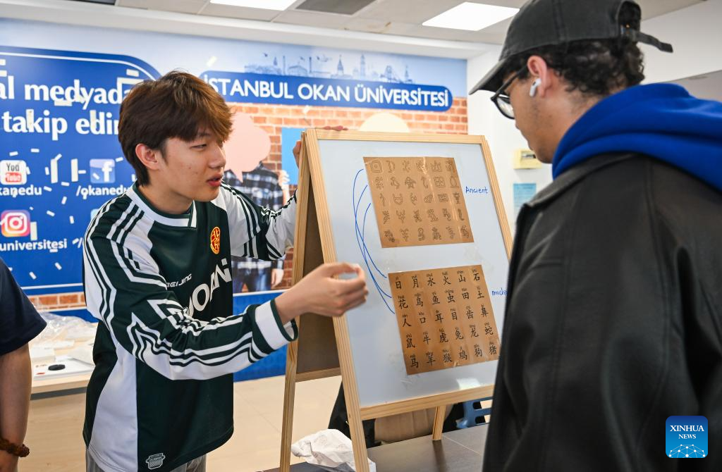University students try writing Chinese characters at Okan University in Istanbul, Türkiye, on April 20, 2026. The Confucius Institute at Okan University in Istanbul, Türkiye, hosted a variety of activities to celebrate the International Chinese Language Day on Monday. (Xinhua/Liu Lei)
