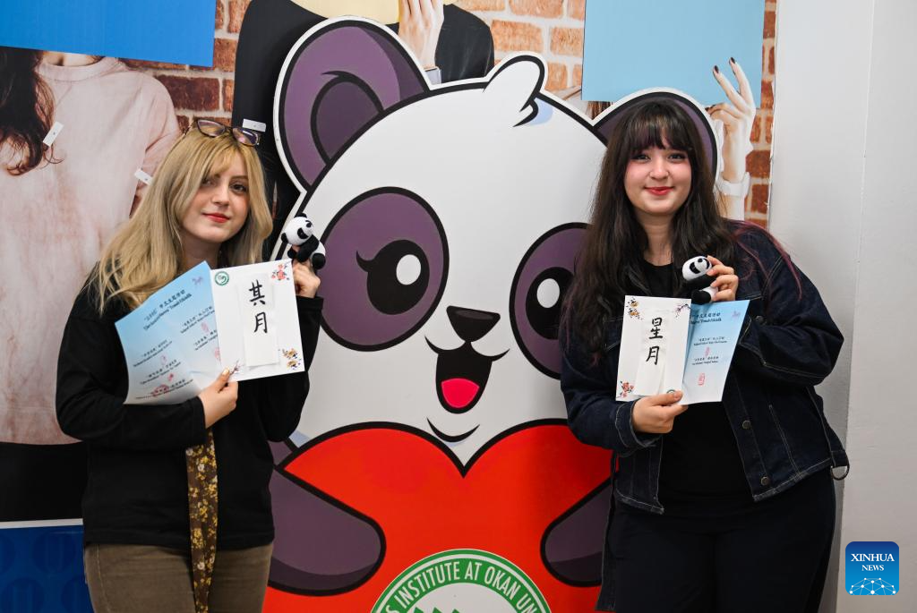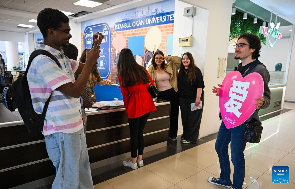 University students pose for photos holding the International Chinese Language Day souvenirs at Okan University in Istanbul, Türkiye, on April 20, 2026. The Confucius Institute at Okan University in Istanbul, Türkiye, hosted a variety of activities to celebrate the International Chinese Language Day on Monday. (Xinhua/Liu Lei)