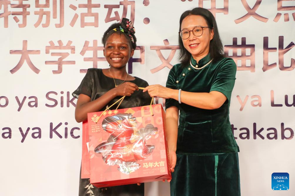 Chinese Ambassador to Tanzania Chen Mingjian (R) presents awards to a contestant at a singing competition in Dar es Salaam, Tanzania, April 20, 2026. Tanzanian students gathered on Monday at the Confucius Institute at the University of Dar es Salaam to mark the United Nations (UN) Chinese Language Day through a vibrant singing competition showcasing cultural exchange and linguistic enthusiasm.(Xinhua/Emmanuel Herman)