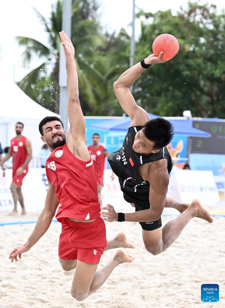 Wang Kaiqiang (R) of China competes during the beach handball men's preliminary round group A match between China and Bahrain at the 6th Asian Beach Games in Sanya, south China's Hainan Province, April 21, 2026. (Xinhua/Yang Guanyu)