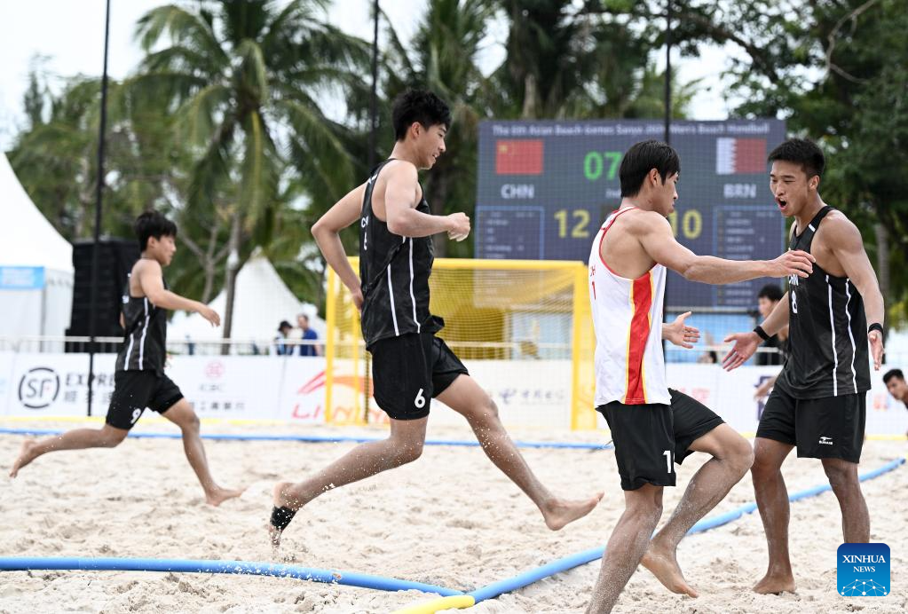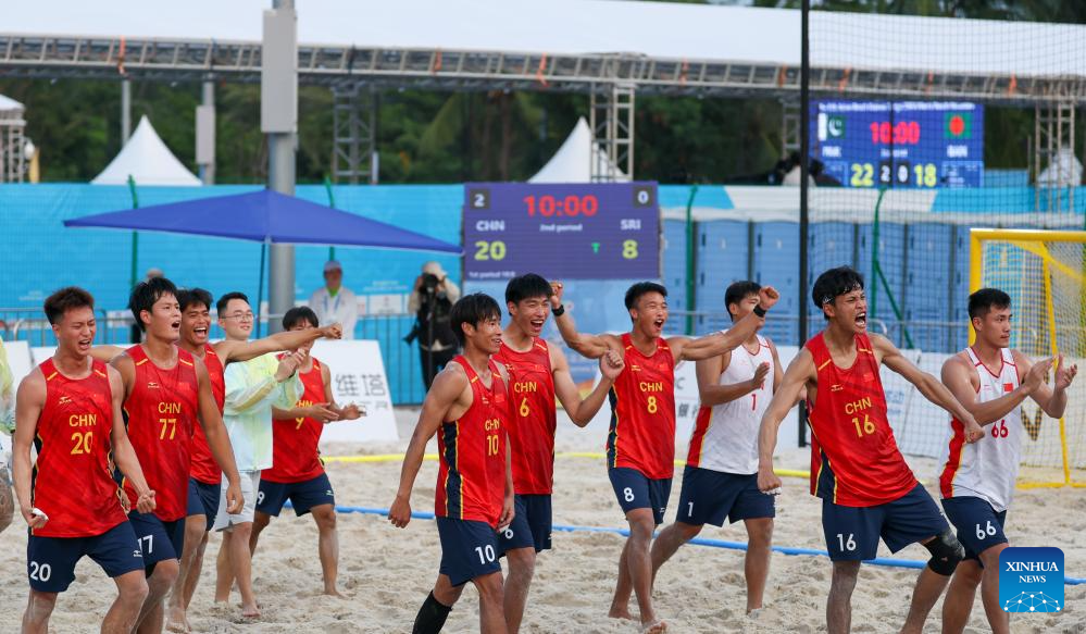 Players of China celebrate after the beach handball men's preliminary round group A match between China and Sri Lanka at the 6th Asian Beach Games in Sanya, south China's Hainan Province, April 21, 2026. (Xinhua/Yang Guanyu)