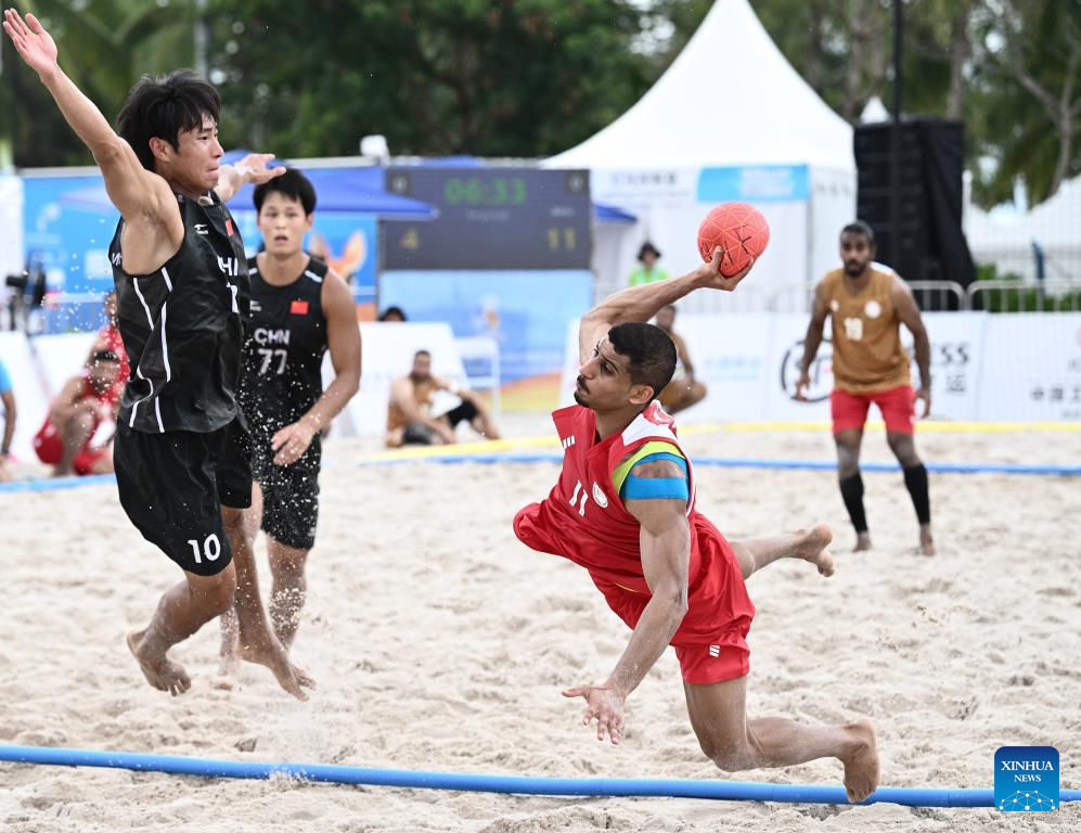 Komail Ghuloom (L) of Bahrain competes during the beach handball men's preliminary round group A match between China and Bahrain at the 6th Asian Beach Games in Sanya, south China's Hainan Province, April 21, 2026. (Xinhua/Yang Guanyu)