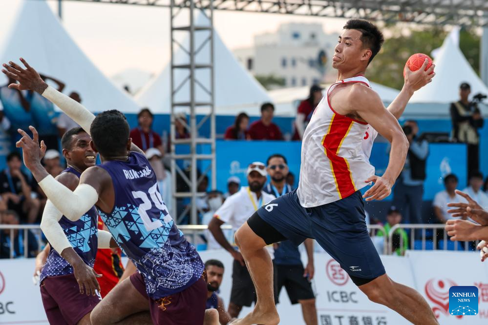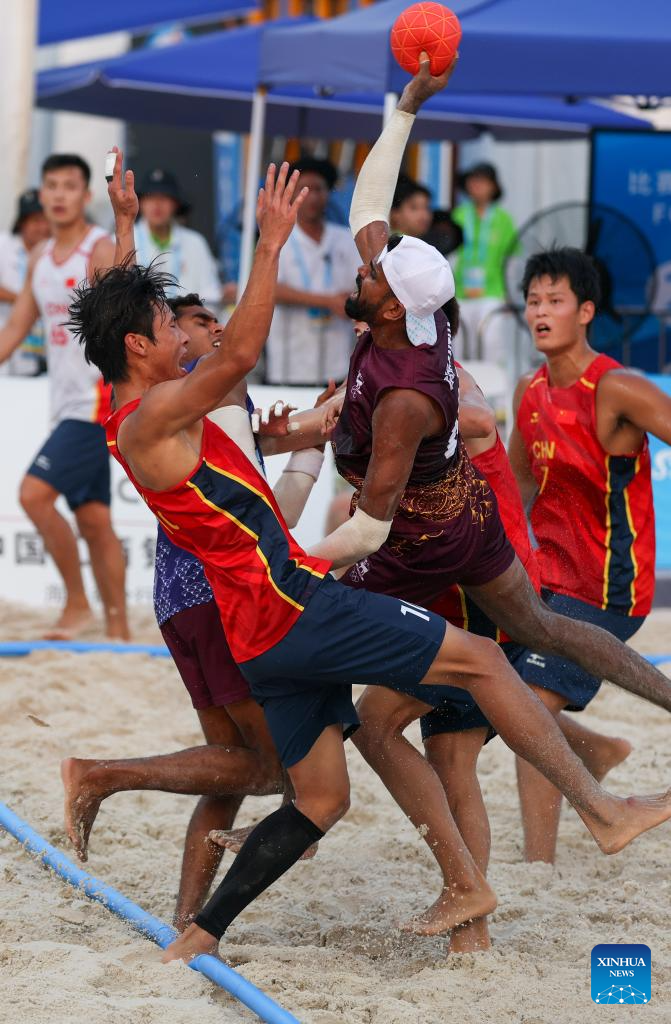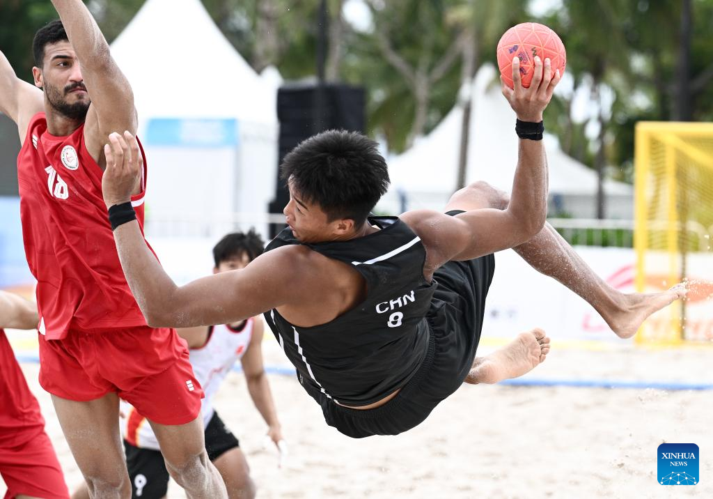 Pang Jiaming (R) of China competes during the beach handball men's preliminary round group A match between China and Sri Lanka at the 6th Asian Beach Games in Sanya, south China's Hainan Province, April 21, 2026. (Xinhua/Li Bo)
