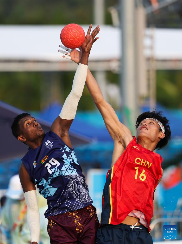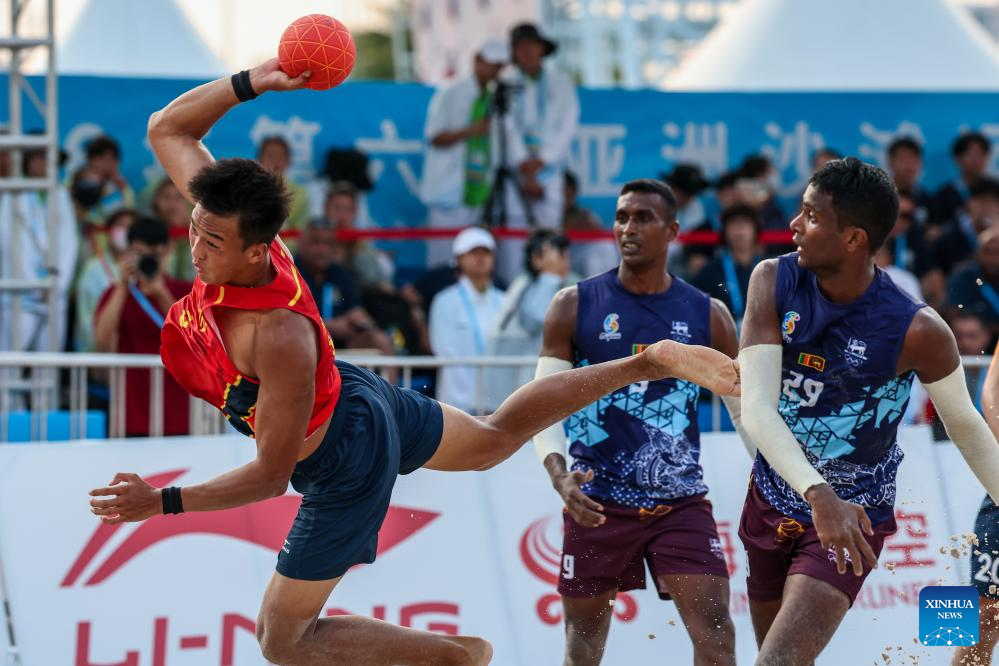 Anil Dasantha Hettigoda Hettigodage (C) of Sri Lanka competes during the beach handball men's preliminary round group A match between China and Sri Lanka at the 6th Asian Beach Games in Sanya, south China's Hainan Province, April 21, 2026. (Xinhua/Yang Guanyu)