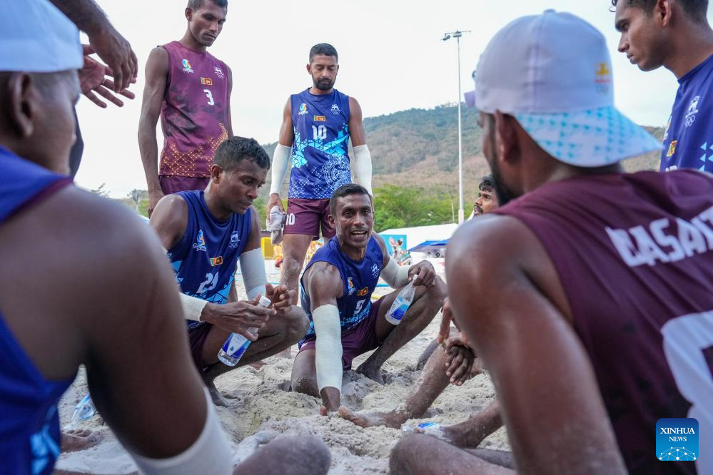 Players of Sri Lanka communicate during the beach handball men's preliminary round group A match between China and Sri Lanka at the 6th Asian Beach Games in Sanya, south China's Hainan Province, April 21, 2026. (Xinhua/Li Bo)