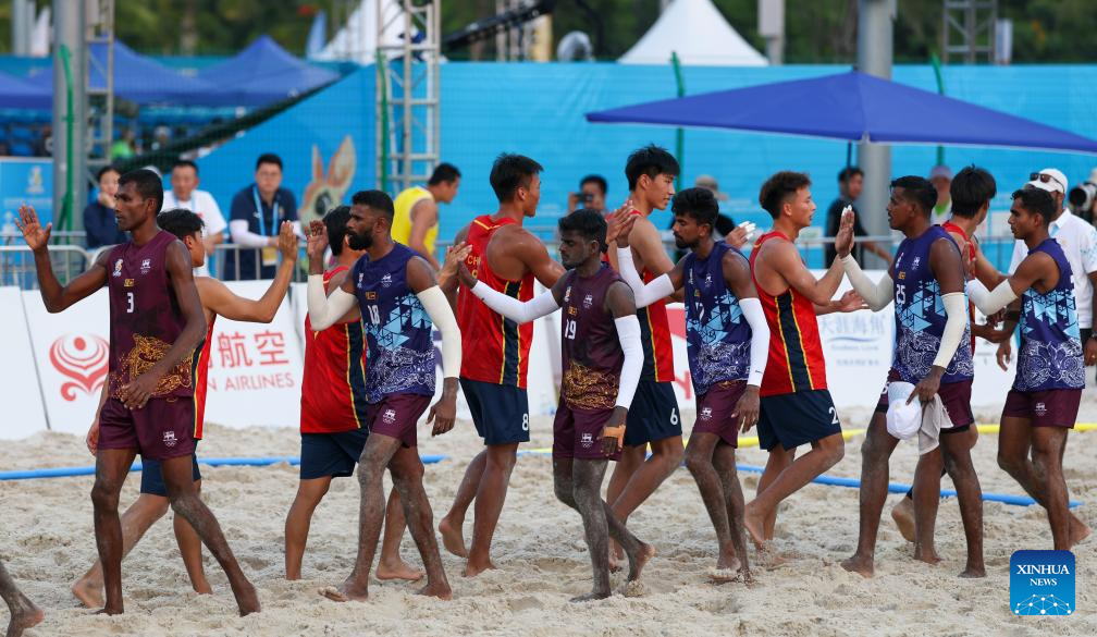 Players of both sides greet each other after the beach handball men's preliminary round group A match between China and Sri Lanka at the 6th Asian Beach Games in Sanya, south China's Hainan Province, April 21, 2026. (Xinhua/Yang Guanyu)