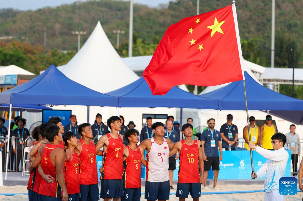 Players of China are seen before the beach handball men's preliminary round group A match between China and Sri Lanka at the 6th Asian Beach Games in Sanya, south China's Hainan Province, April 21, 2026. (Xinhua/Yang Guanyu)