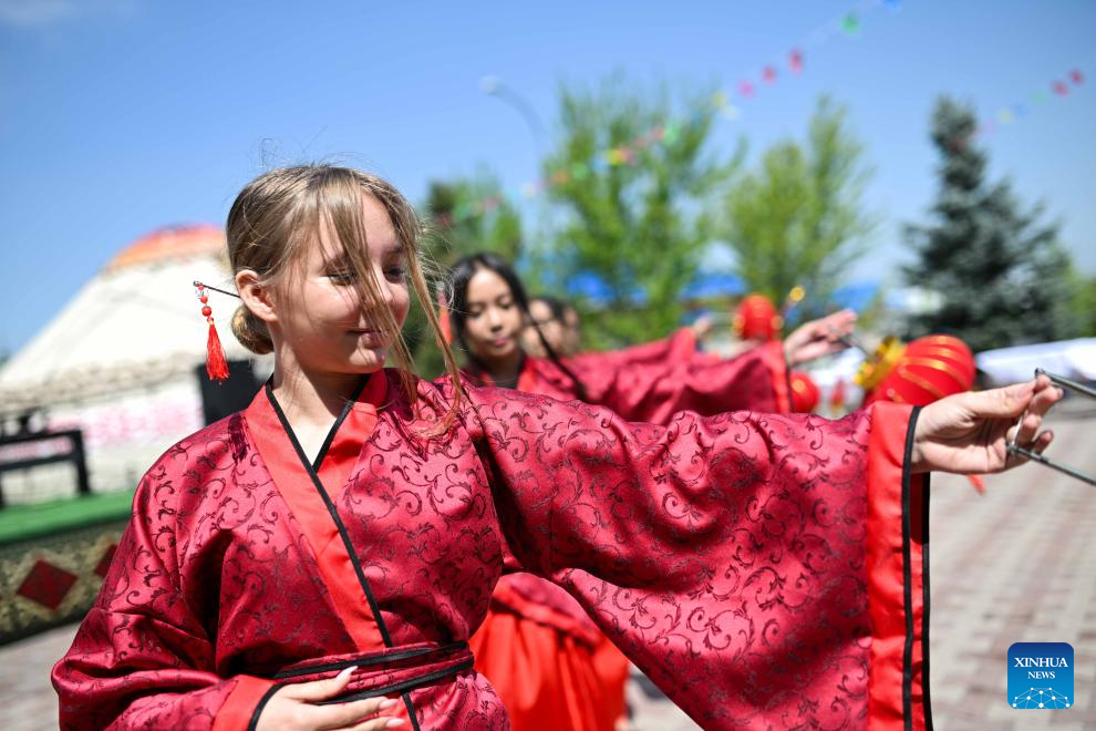 Students in costumes with traditional Chinese elements perform a dance at the 2026 International Chinese Language Day event in Almaty, Kazakhstan, April 20, 2026. A celebration event marking the 2026 International Chinese Language Day was held here Monday. (Xinhua/Li Renzi)