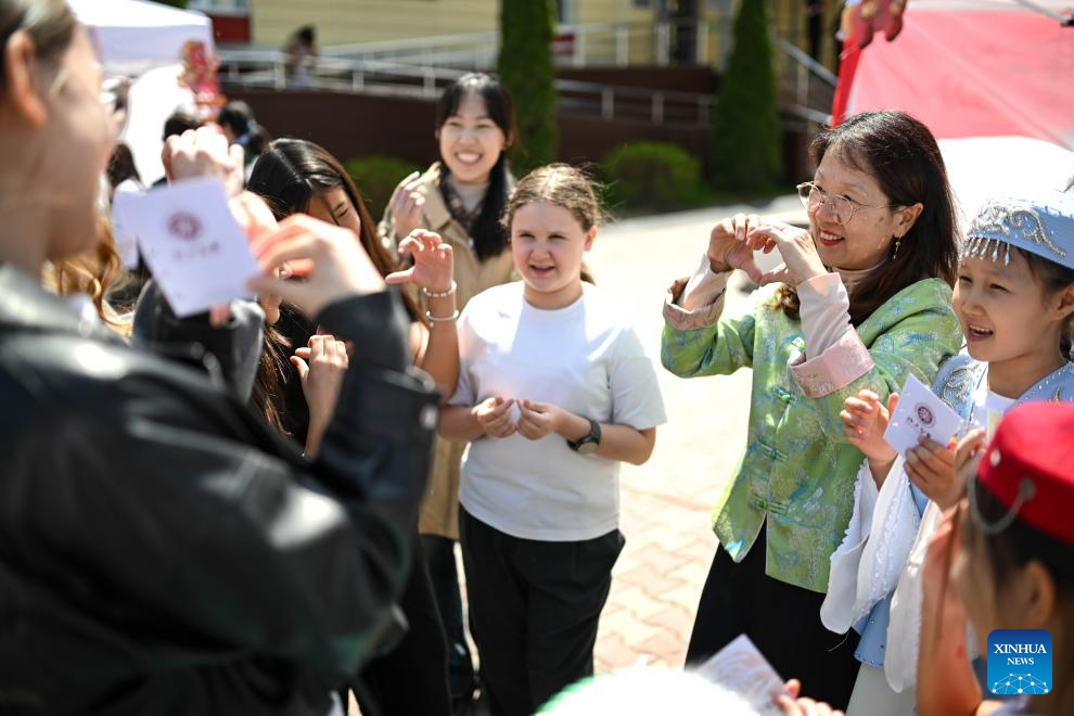A teacher teaches students to speak Chinese at the 2026 International Chinese Language Day event in Almaty, Kazakhstan, April 20, 2026. A celebration event marking the 2026 International Chinese Language Day was held here Monday. (Xinhua/Li Renzi)