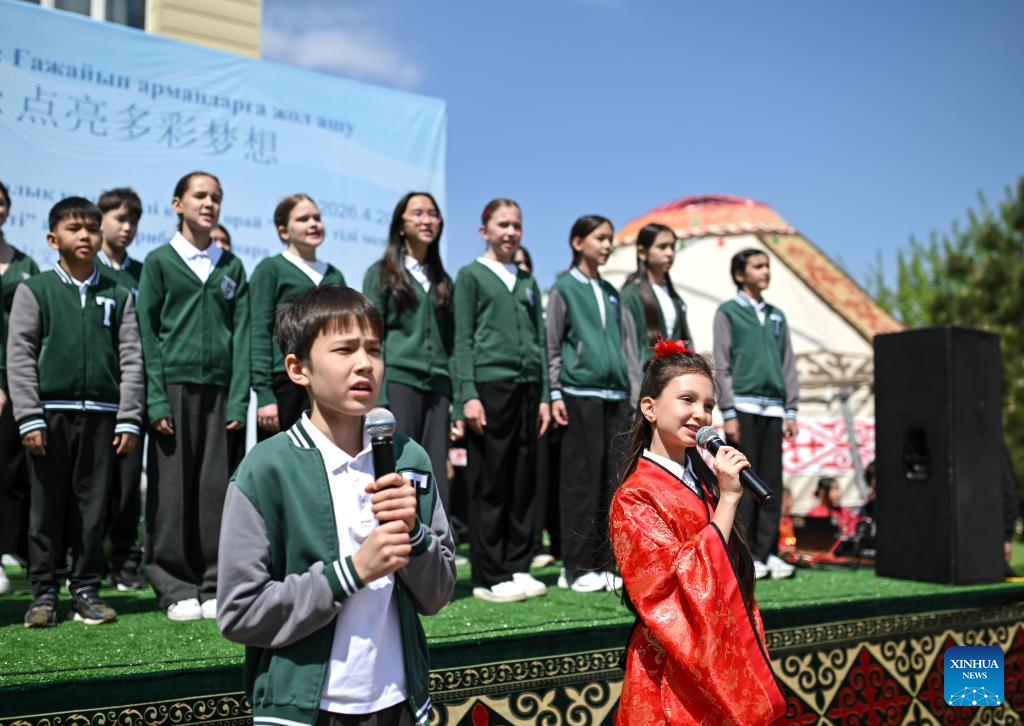 Students sing a Chinese song at the 2026 International Chinese Language Day event in Almaty, Kazakhstan, April 20, 2026. A celebration event marking the 2026 International Chinese Language Day was held here Monday. (Xinhua/Li Renzi)