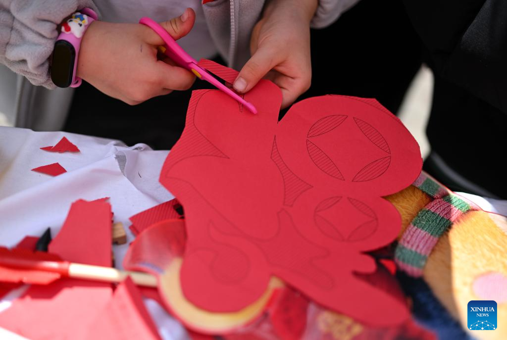 A student learns to make paper cutting at the 2026 International Chinese Language Day event in Almaty, Kazakhstan, April 20, 2026. A celebration event marking the 2026 International Chinese Language Day was held here Monday. (Xinhua/Li Renzi)