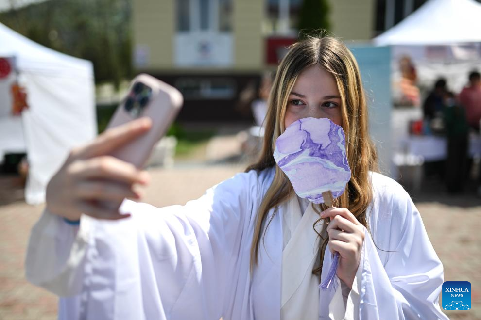 A student in costumes with traditional Chinese elements takes a selfie at the 2026 International Chinese Language Day event in Almaty, Kazakhstan, April 20, 2026. A celebration event marking the 2026 International Chinese Language Day was held here Monday. (Xinhua/Li Renzi)