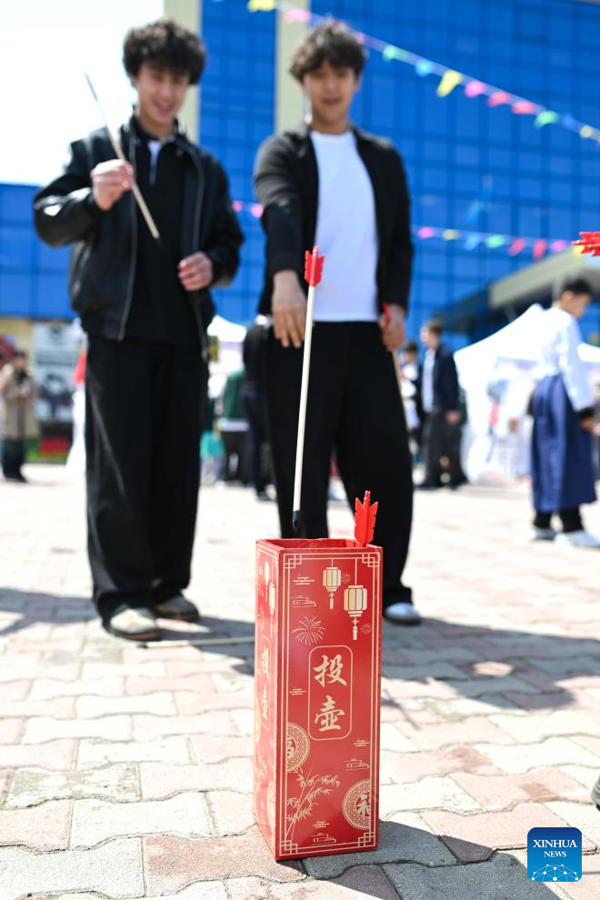 Students enjoy touhu, a traditional Chinese game also known as pitch-pot, at the 2026 International Chinese Language Day event in Almaty, Kazakhstan, April 20, 2026. A celebration event marking the 2026 International Chinese Language Day was held here Monday. (Xinhua/Li Renzi)
