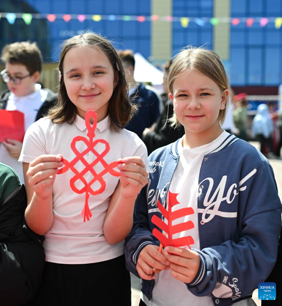 Students display their paper cutting works at the 2026 International Chinese Language Day event in Almaty, Kazakhstan, April 20, 2026. A celebration event marking the 2026 International Chinese Language Day was held here Monday. (Xinhua/Li Renzi)