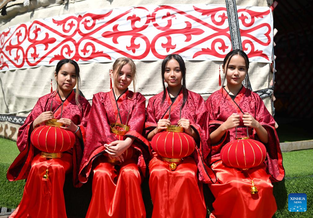 Students in costumes with tradition Chinese elements pose for photos at the 2026 International Chinese Language Day event in Almaty, Kazakhstan, April 20, 2026. A celebration event marking the 2026 International Chinese Language Day was held here Monday. (Xinhua/Li Renzi)