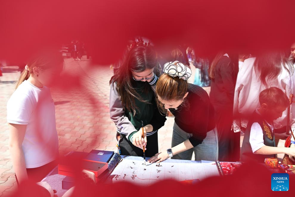 A teacher teaches students to write Chinese calligraphy at the 2026 International Chinese Language Day event in Almaty, Kazakhstan, April 20, 2026. A celebration event marking the 2026 International Chinese Language Day was held here Monday. (Xinhua/Li Renzi)