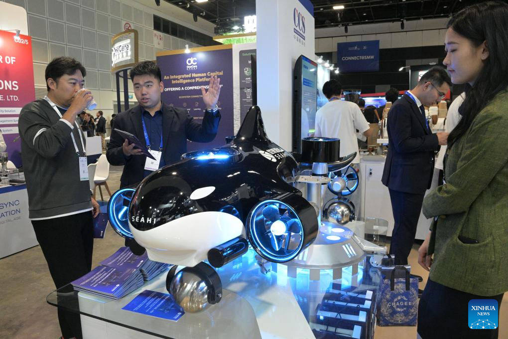 A marine robot is on display during the Singapore Maritime Week (SMW) 2026 in Singapore on April 21, 2026. Singapore Maritime Week (SMW) 2026 runs from April 20 to 24 this year, bringing together more than 20,000 participants from nearly 80 countries and regions, including ministers, senior government officials, industry leaders and maritime professionals. (Photo by Then Chih Wey/Xinhua)