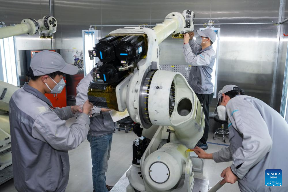 A robot is tested before its delivery in a workshop of Inovance in Jiangning economic development zone of Nanjing, east China's Jiangsu Province, on March 17, 2026. In recent years, Jiangsu has focused on developing new quality productive forces, pursuing high-end, intelligent and globalized development, using advanced manufacturing to power high-quality economic growth.