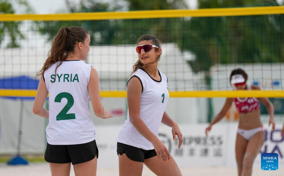 Maguy Alshaikh (R) talks with Luiza Moussa of Syria during the beach volleyball women's preliminary pool E match between Ito Sakura/Ishii Miki of Japan and Maguy Alshaikh/Luiza Moussa of Syria at the 6th Asian Beach Games in Sanya, south China's Hainan Province, April 24, 2026. (Xinhua/Jigme Dorje)