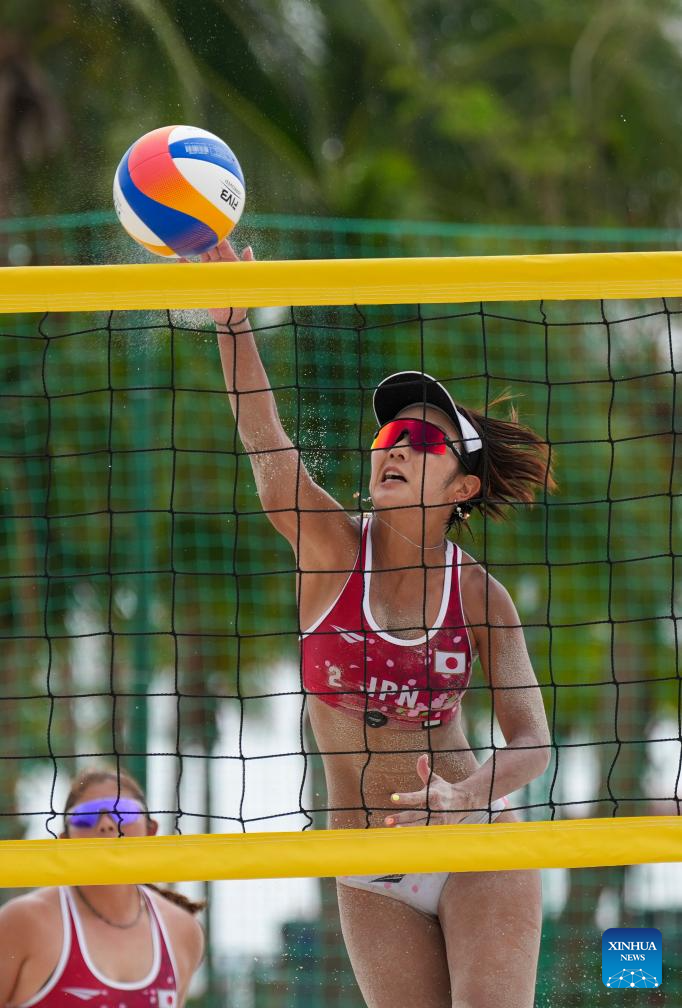 Ishii Miki of Japan spikes the ball during the beach volleyball women's preliminary pool E match between Ito Sakura/Ishii Miki of Japan and Maguy Alshaikh/Luiza Moussa of Syria at the 6th Asian Beach Games in Sanya, south China's Hainan Province, April 24, 2026. (Xinhua/Jigme Dorje)