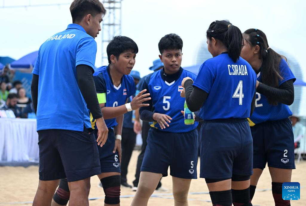 Players of Thailand talk at a timeout during the Beach Kabaddi Women's Team Group B match between Thailand and Chinese Taipei at the 6th Asian Beach Games in Sanya, south China's Hainan Province, April 24, 2026. (Xinhua/Zhao Zishuo)