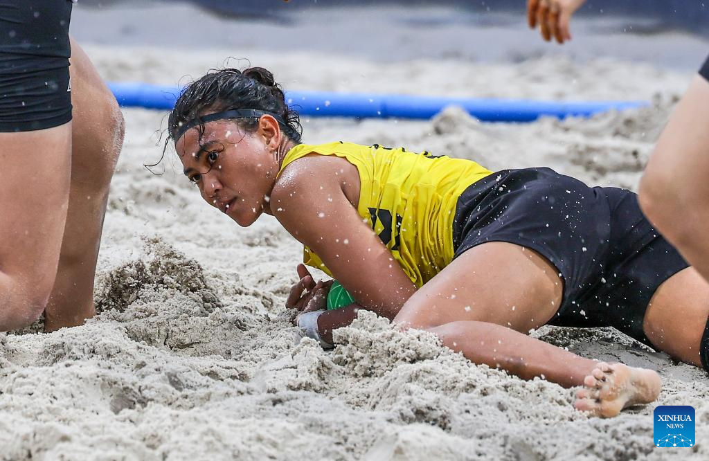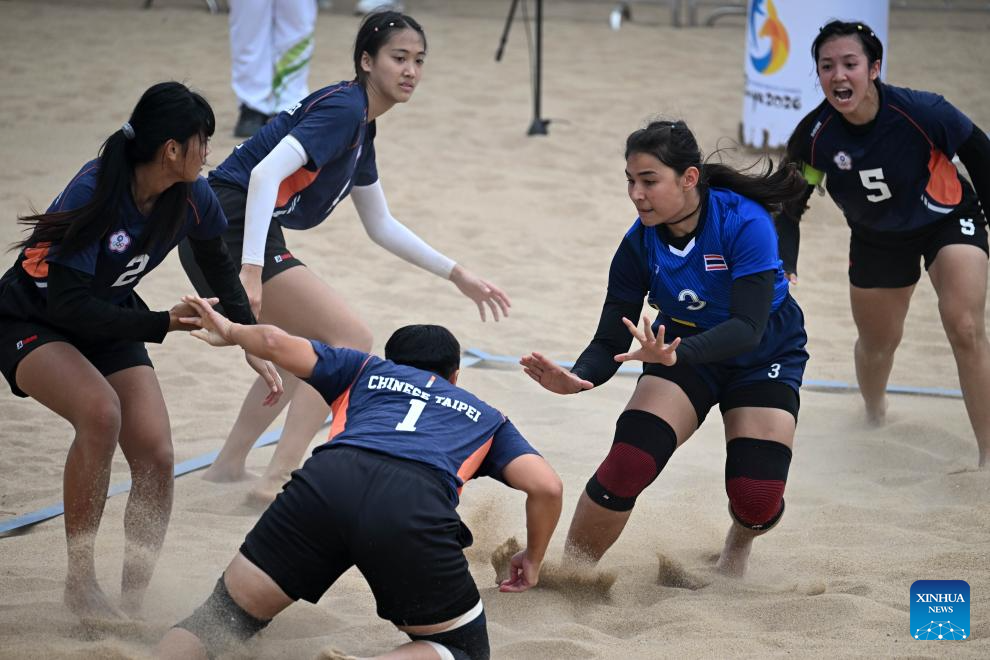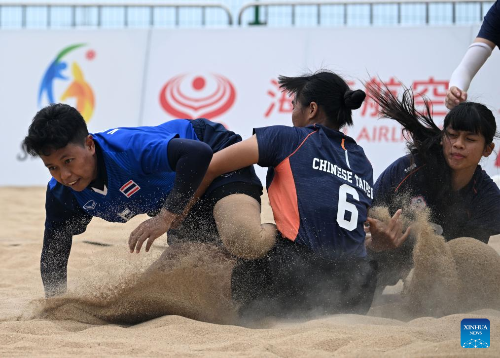 Diana Deesalarm (2nd R) of Thailand competes during the Beach Kabaddi Women's Team Group B match between Thailand and Chinese Taipei at the 6th Asian Beach Games in Sanya, south China's Hainan Province, April 24, 2026. (Xinhua/Zhao Zishuo)