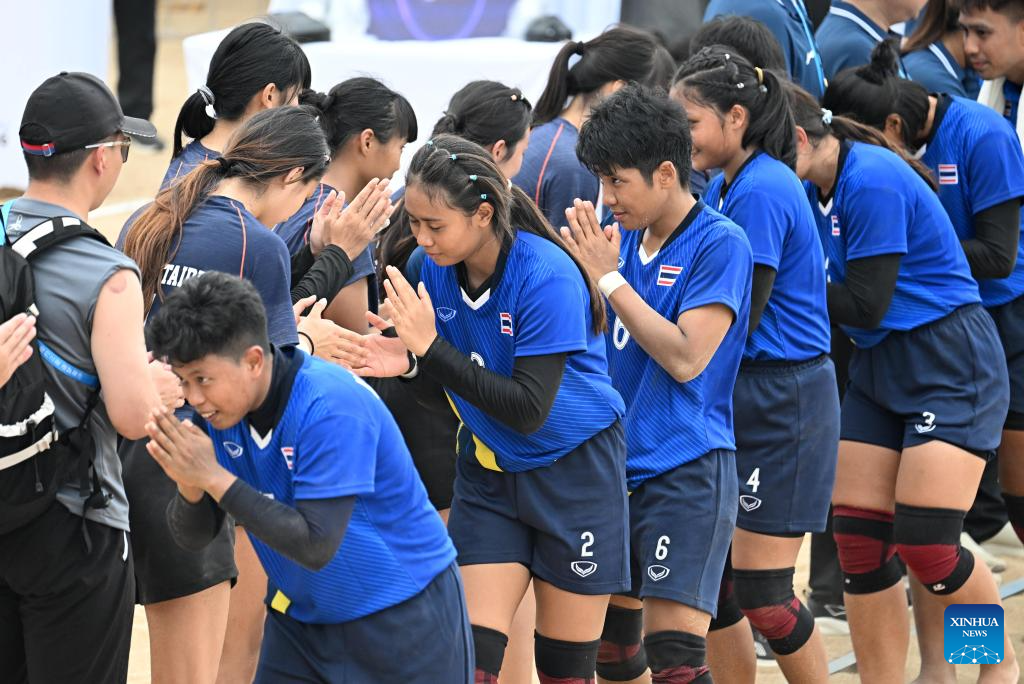 Players of both sides greet each other after the Beach Kabaddi Women's Team Group B match between Thailand and Chinese Taipei at the 6th Asian Beach Games in Sanya, south China's Hainan Province, April 24, 2026. (Xinhua/Zhao Zishuo)