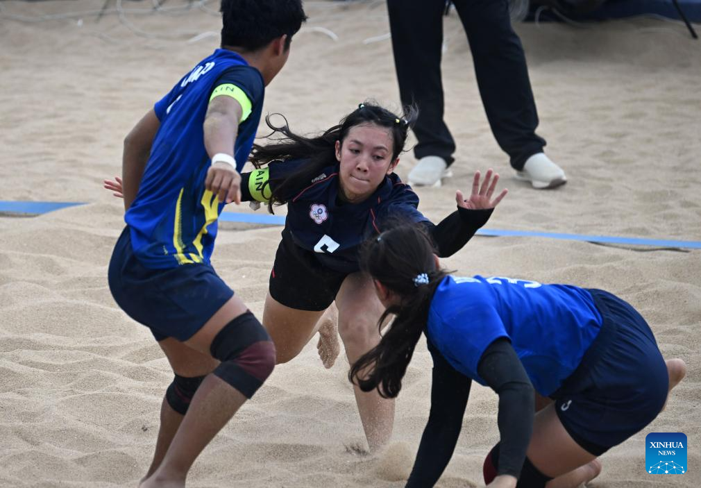 Dai Jing-Yu (C) of Chinese Taipei competes during the Beach Kabaddi Women's Team Group B match between Thailand and Chinese Taipei at the 6th Asian Beach Games in Sanya, south China's Hainan Province, April 24, 2026. (Xinhua/Zhao Zishuo)