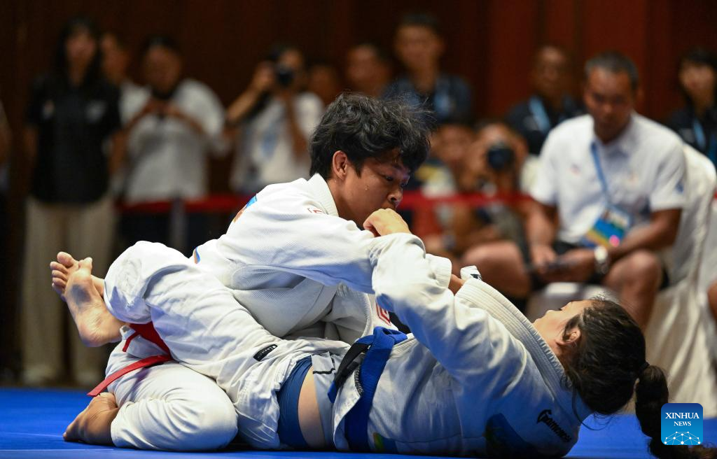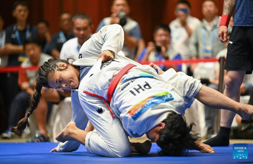 Emily Rosalynn Thomas (L) of the Philippines competes with Annie Ramirez of the Philippines during their Jiu Jitsu women's -57kg gold medal contest at the 6th Asian Beach Games in Sanya, south China's Hainan Province, April 24, 2026. (Xinhua/Bei He)